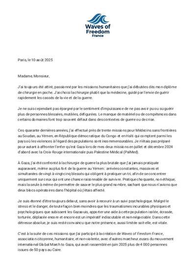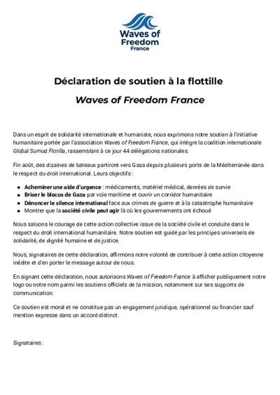 Ce document officialise un soutien public à la flottille Waves of Freedom France, intégrée à la coalition internationale Global Sumud Flotilla.